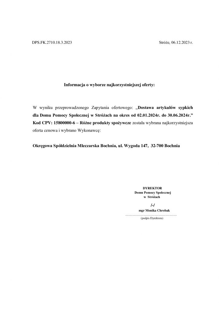 Informacja o wyborze najkorzystniejszej oferty na dostawę artykułów sypkich w I połowie 2024