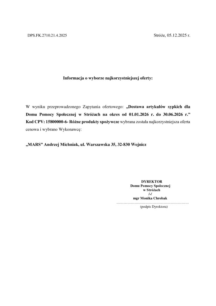 Informacja o wyborze najkorzystniejszej oferty na dostawę artykułów sypkich w I połowie 2026