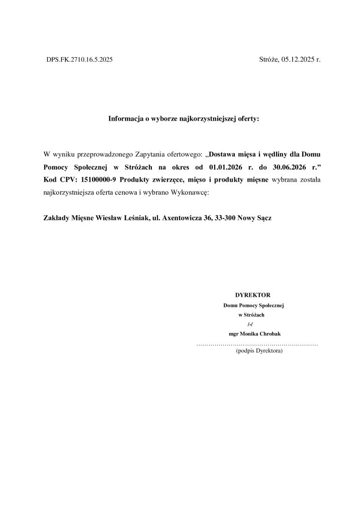 Informacja o wyborze najkorzystniejszej oferty na dostawę mięsa i wędlin w I połowie 2026