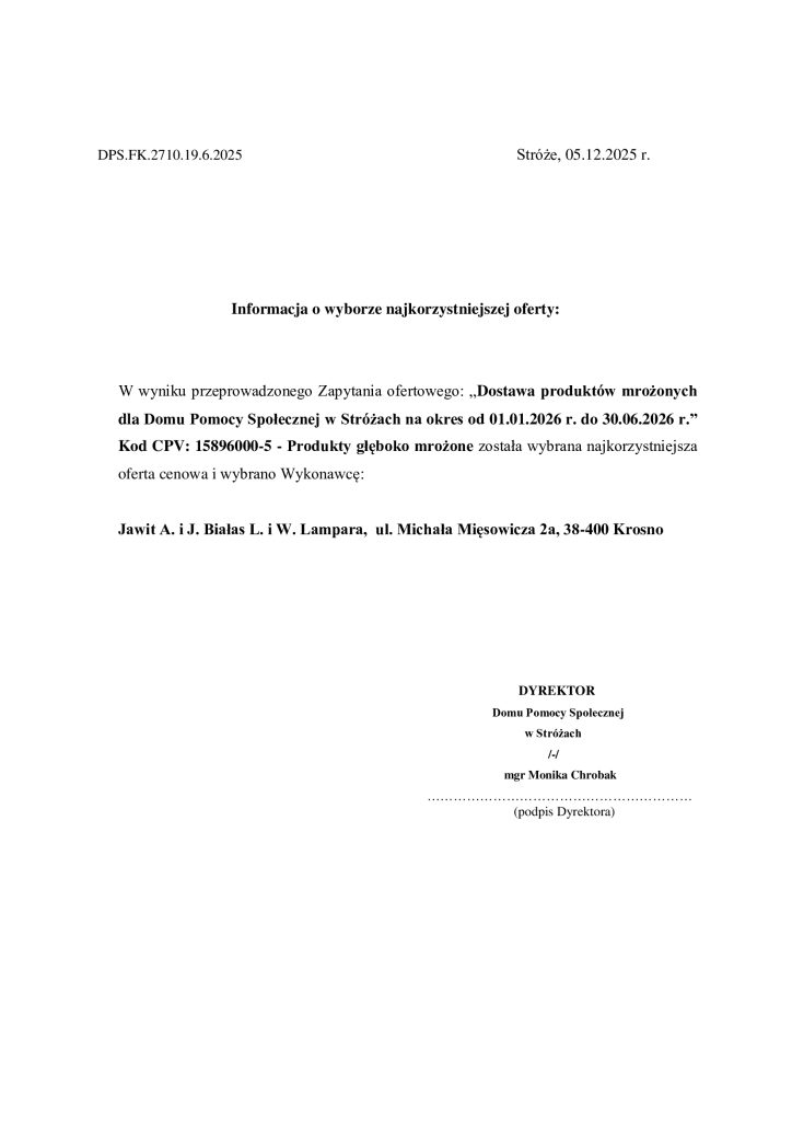 Informacja o wyborze najkorzystniejszej oferty na dostawę produktów mrożonych w I połowie 2026