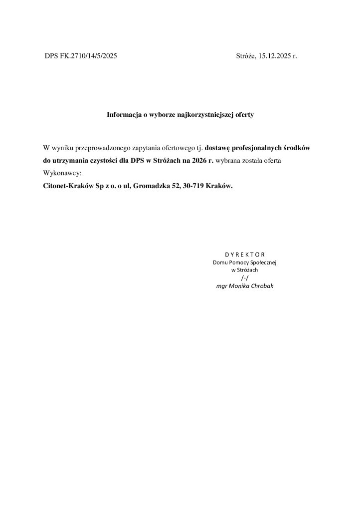 Informacja o wyborze najkorzystniejszej oferty na dostawę profesjonalnych środków do utrzymania czystości w I połowie 2026 roku