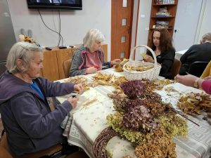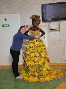 W ramach zajęć na terapii powstała niezwykła praca plastyczna – „Pani Jesień”. To przestrzenna postać naturalnej wielkości, wykonana wspólnie przez Mieszkańców z kartonu, kolorowych liści i innych darów natury. Tworzenie tej pracy było nie tylko okazją do rozwijania zdolności manualnych, ale także do wspólnej zabawy, rozmów i spędzenia czasu w miłej, jesiennej atmosferze. Gotowa „Pani Jesień” zachwyca barwami i pomysłowością, witając wszystkich odwiedzających nasz Dom.
