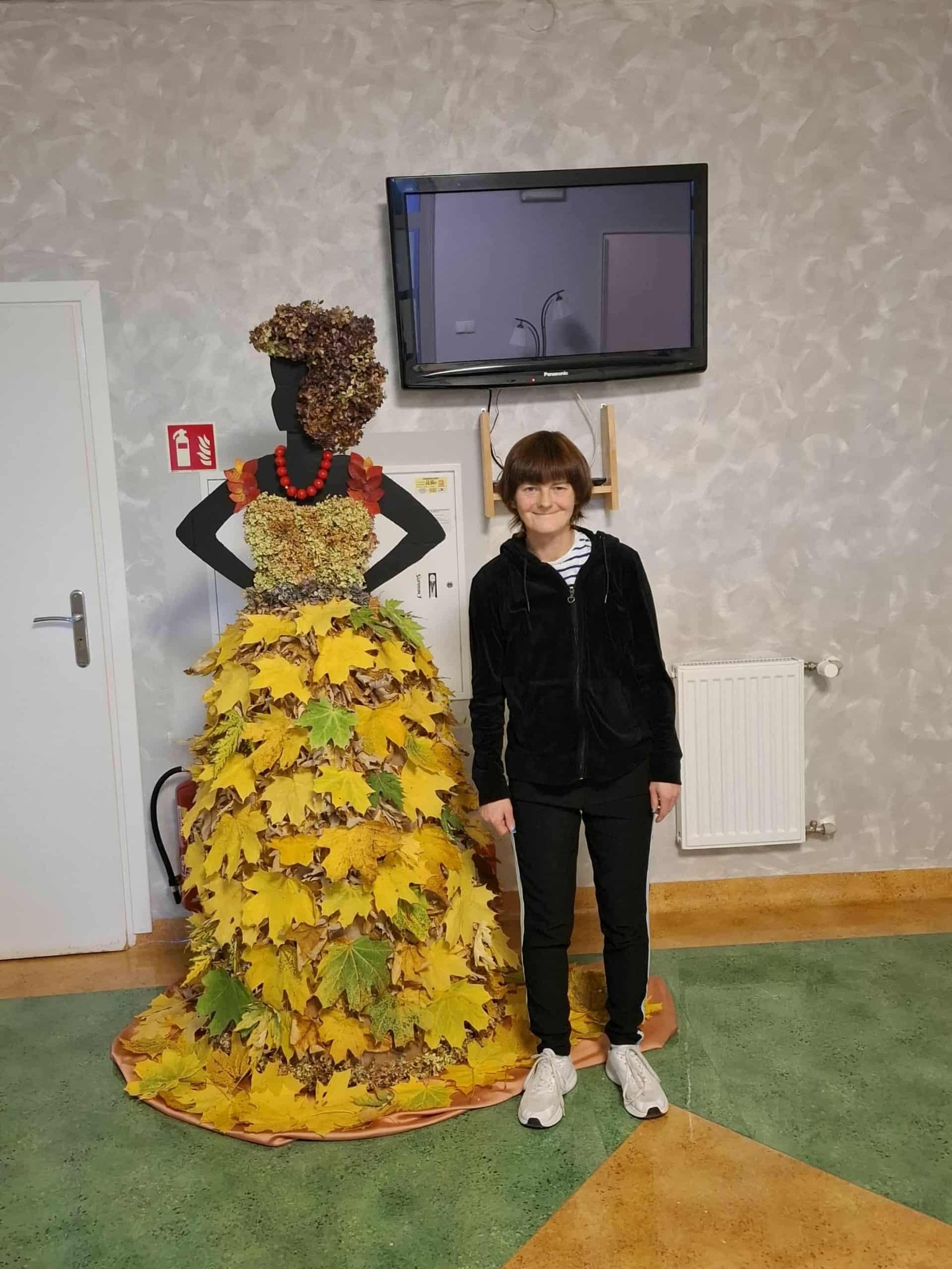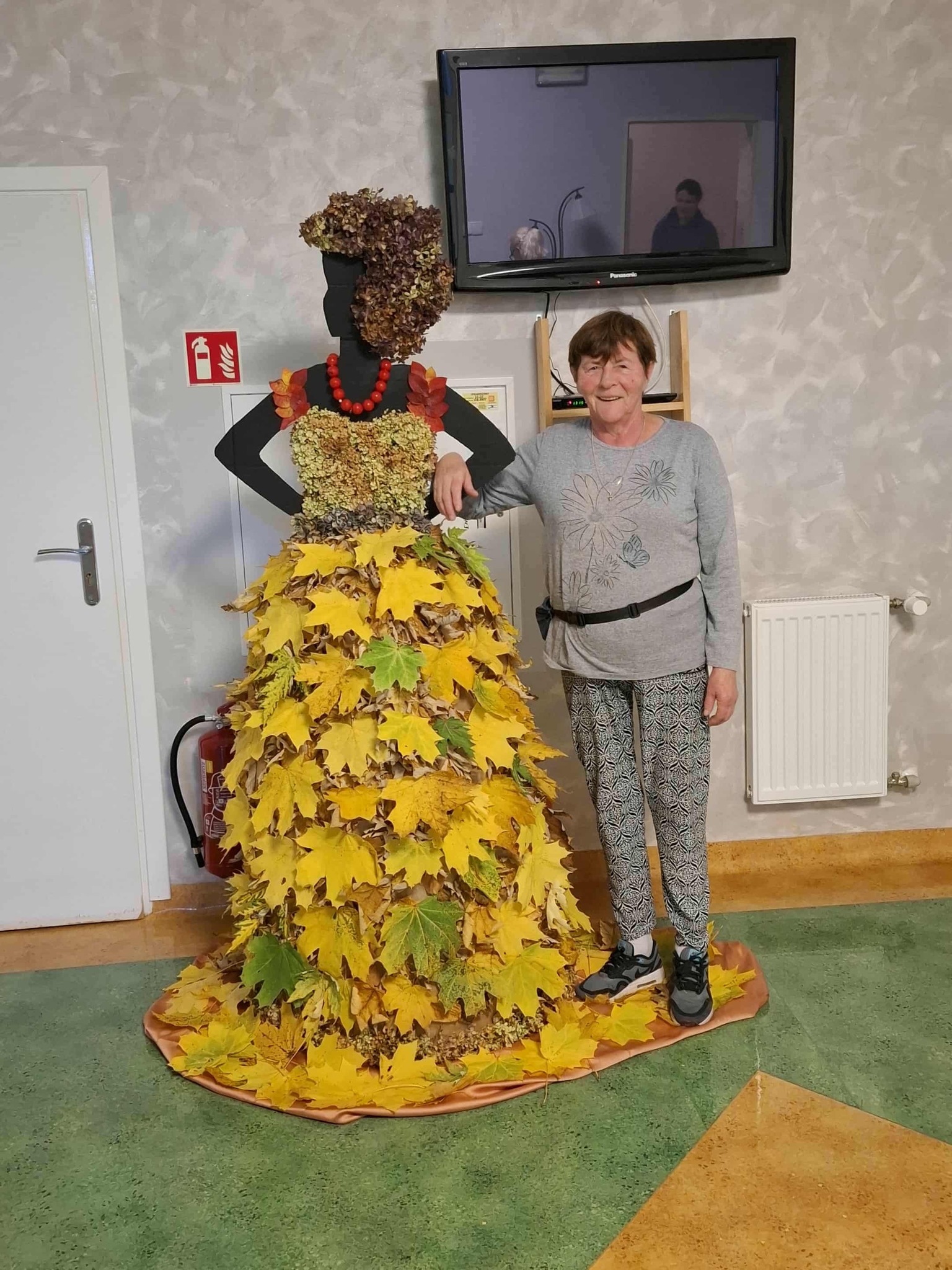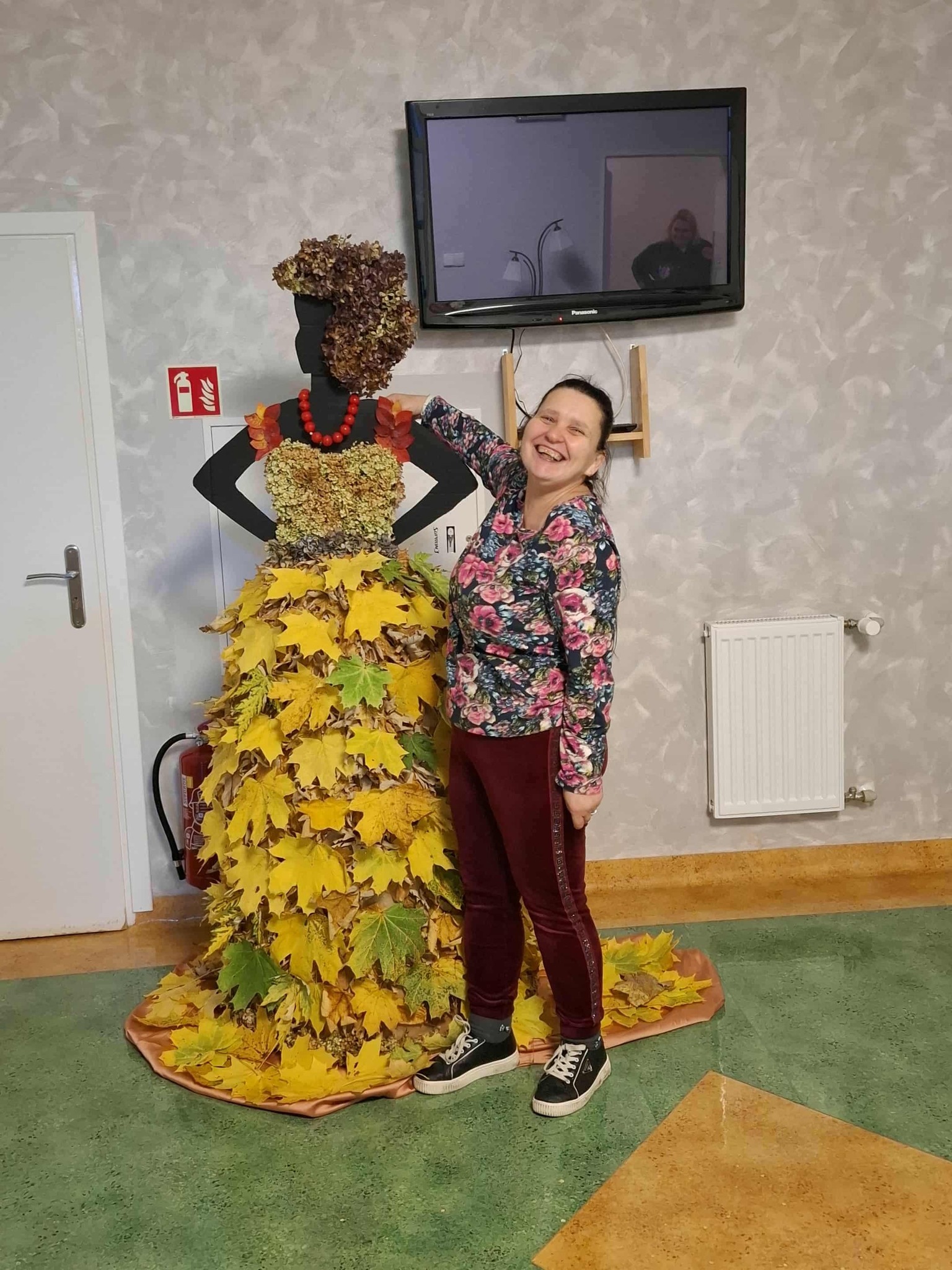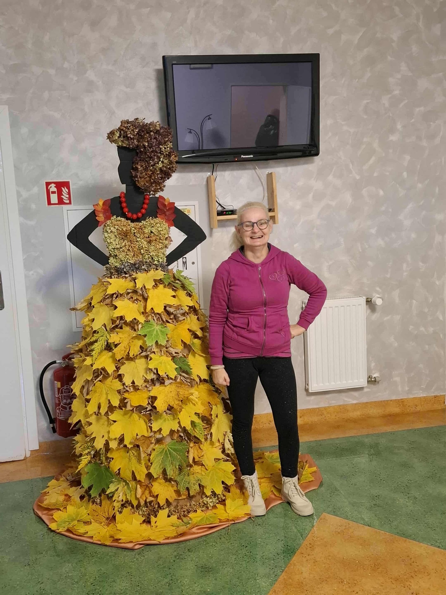 W ramach zajęć na terapii powstała niezwykła praca plastyczna – „Pani Jesień”. To przestrzenna postać naturalnej wielkości, wykonana wspólnie przez Mieszkańców z kartonu, kolorowych liści i innych darów natury. Tworzenie tej pracy było nie tylko okazją do rozwijania zdolności manualnych, ale także do wspólnej zabawy, rozmów i spędzenia czasu w miłej, jesiennej atmosferze. Gotowa „Pani Jesień” zachwyca barwami i pomysłowością, witając wszystkich odwiedzających nasz Dom.