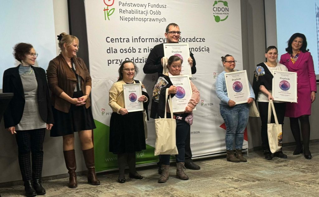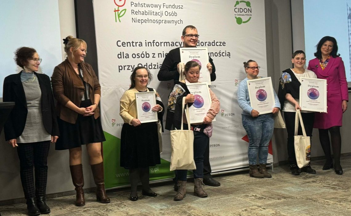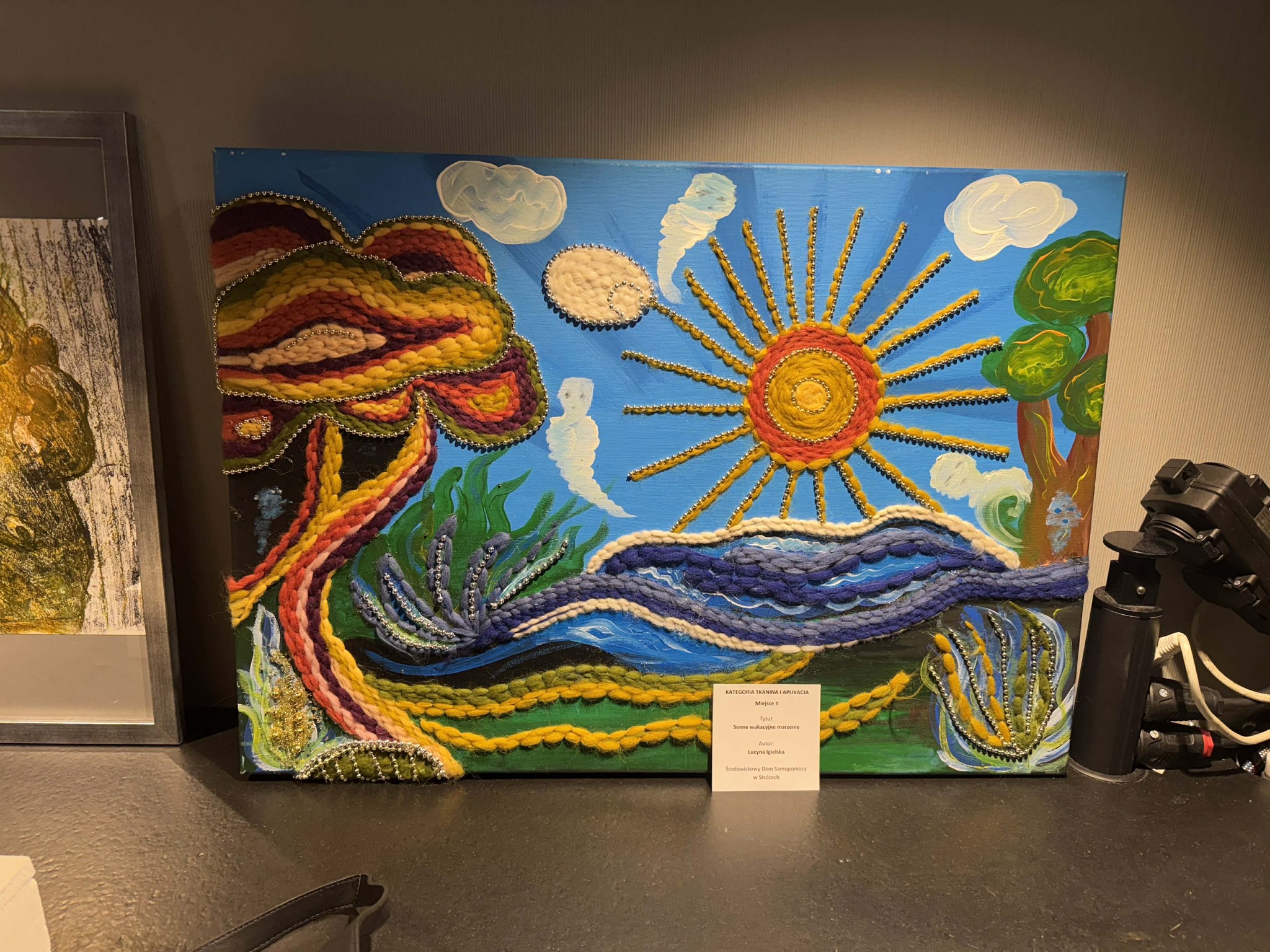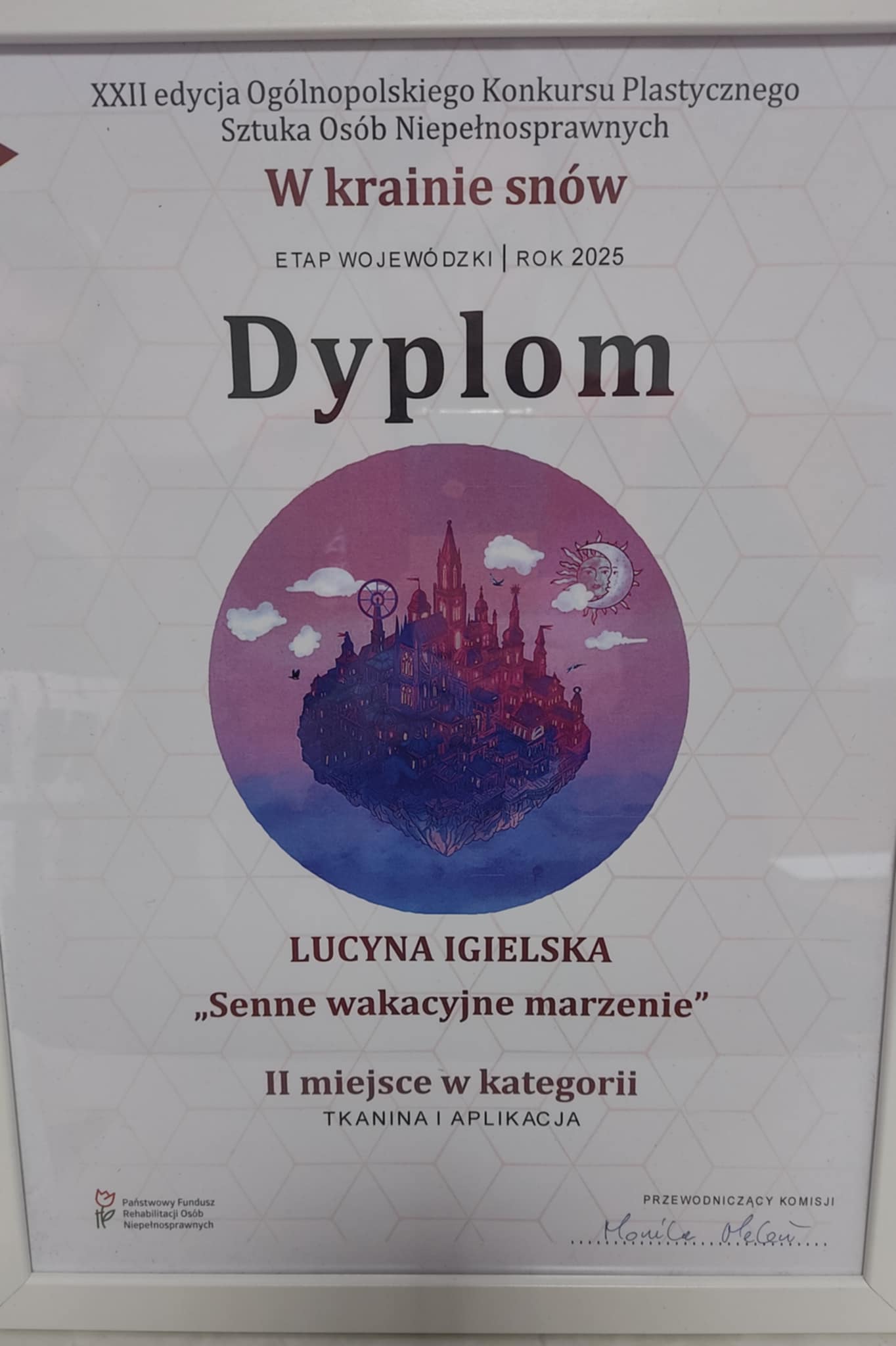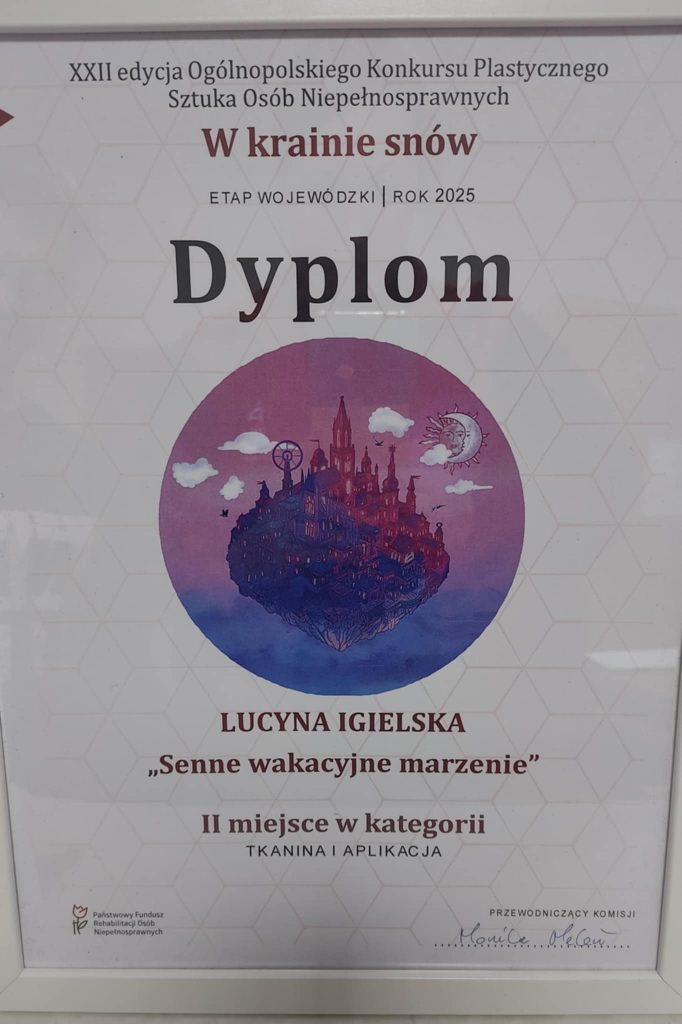 Chwalimy się!!! W dniu 3 grudnia 2025 wzięliśmy udział w gali XXII edycji Ogólnopolskiego Konkursu Plastycznego Sztuka Osób Niepełnosprawnych organizowany przez PEFRON. Praca wykonana przez naszą uczestniczkę Lucynę zajęła II miejsce w kategorii tkanina i aplikacja.