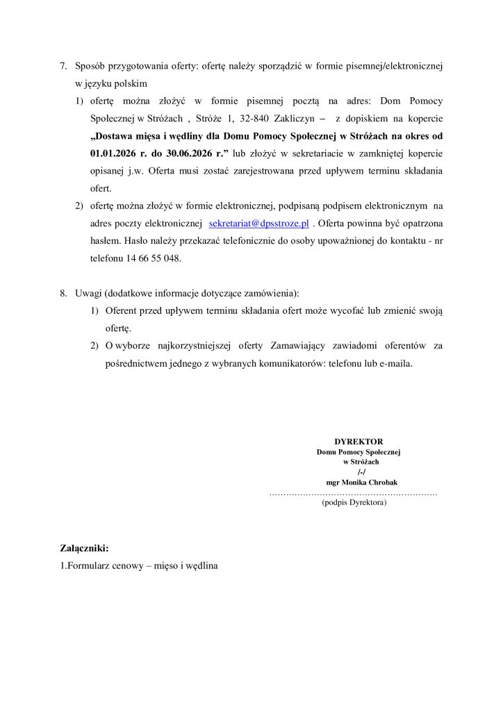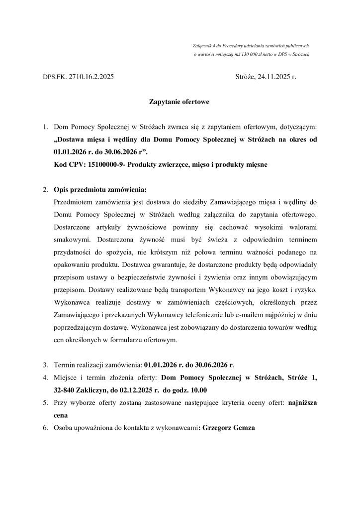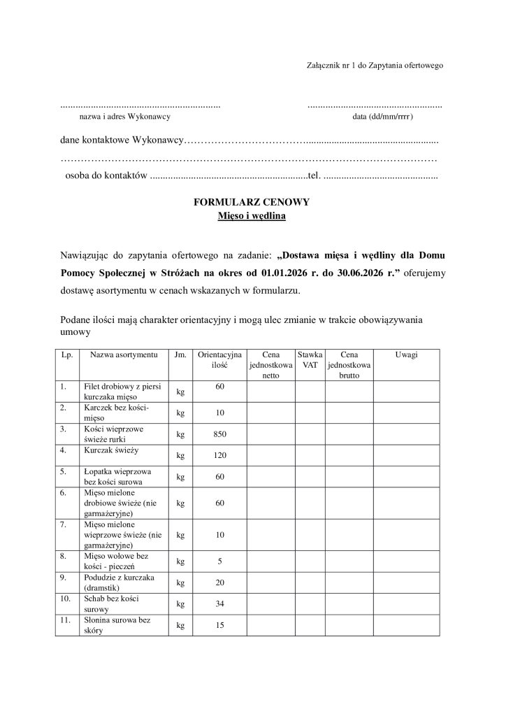 Zapytanie ofertowe na dostawę mięs i wędlin w I półroczu 2026
