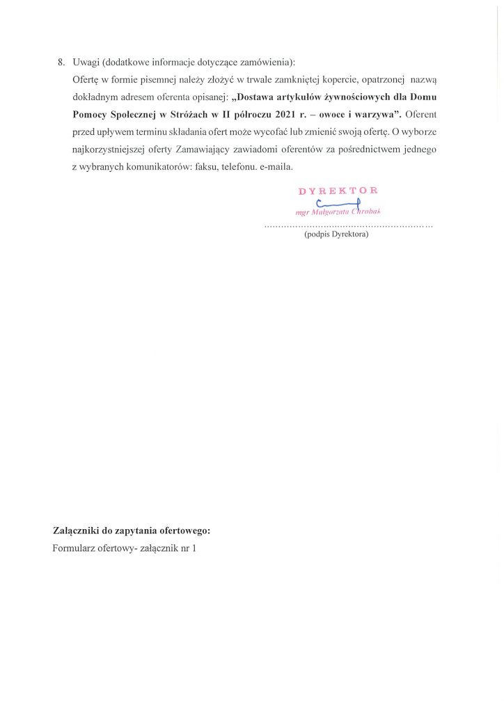 Zapytanie ofertowe na dostawę owoców i warzyw w II półroczu 2021